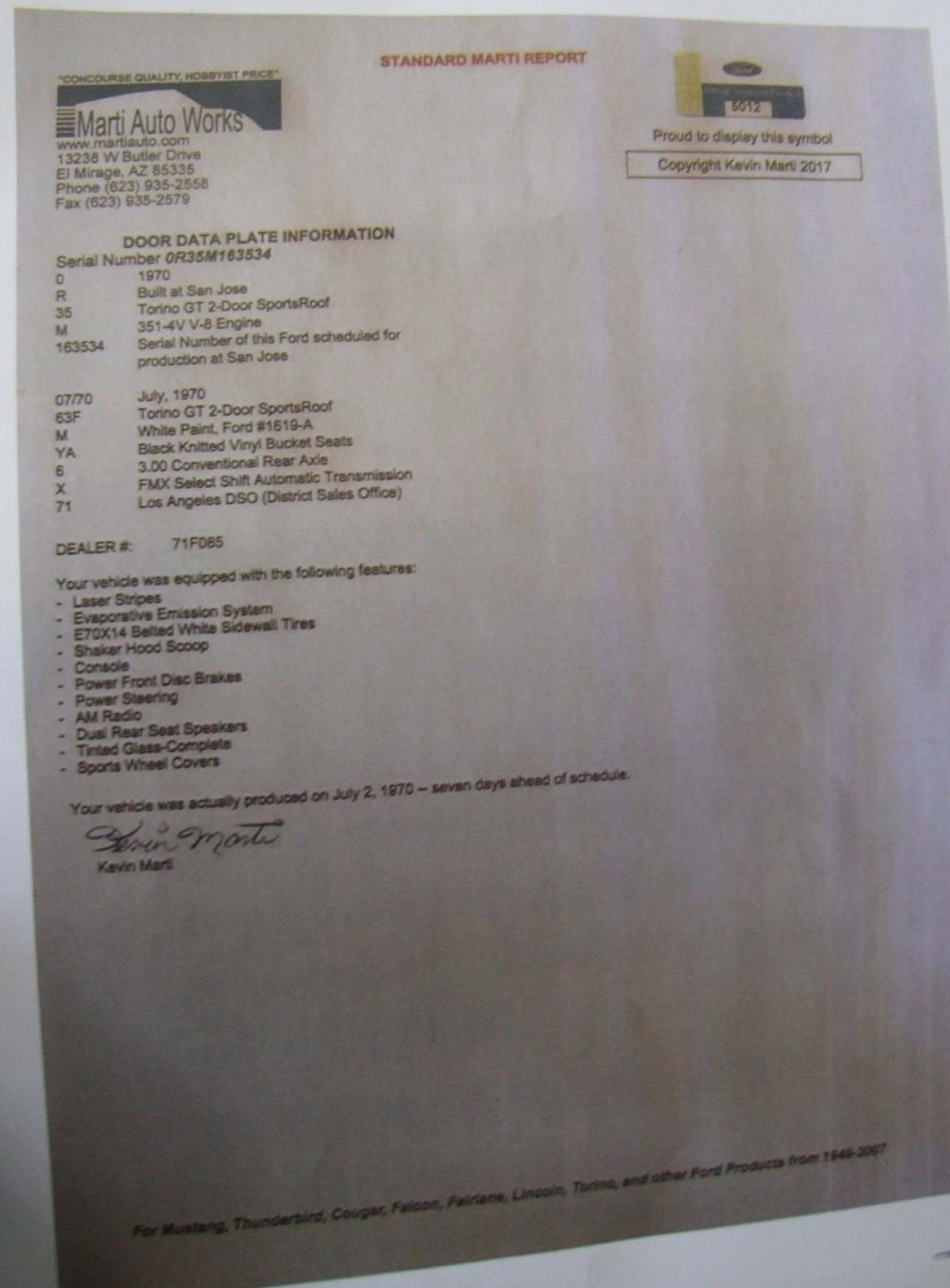 1970 Ford Torino GT 351 V8 Cleveland 4V auto VIN OR35M163534 Genuine Torino GT with original factory options, For full list of options check Marti Report New parts fitted prior to shipping 1) all new interior including full seat kit ,carpet, headliner etc 2) all new exhaust 3) new fuel tank 4) new mags and tyres instock now $54,900 Car ID#644 - Return to Index |