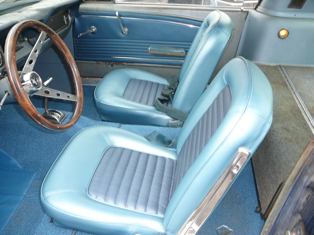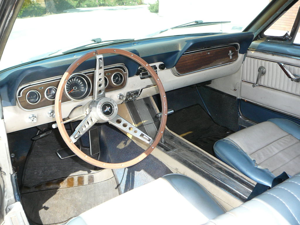 1966 Ford Mustang Coupe 289 V8 Auto VIN 6RO7C174297 Original C Code 289 2 V V8, C4 auto trans, power steering, manual drum brakes, with pony interior (deluxe) redone to new specs in blue /white. Complete with deluxe woodgrain steering wheel. Note drivers door has been replaced with no courtesy light or door tag reinstalled (easy to redo). Nice straight coupe with acceptable silver blue exterior. Excellent driving car with dual flowmaster exhaust system, strong motor / trans, good tyres. Was used as a daily driver in LA. SOLD Car ID#188 - Return to Index |