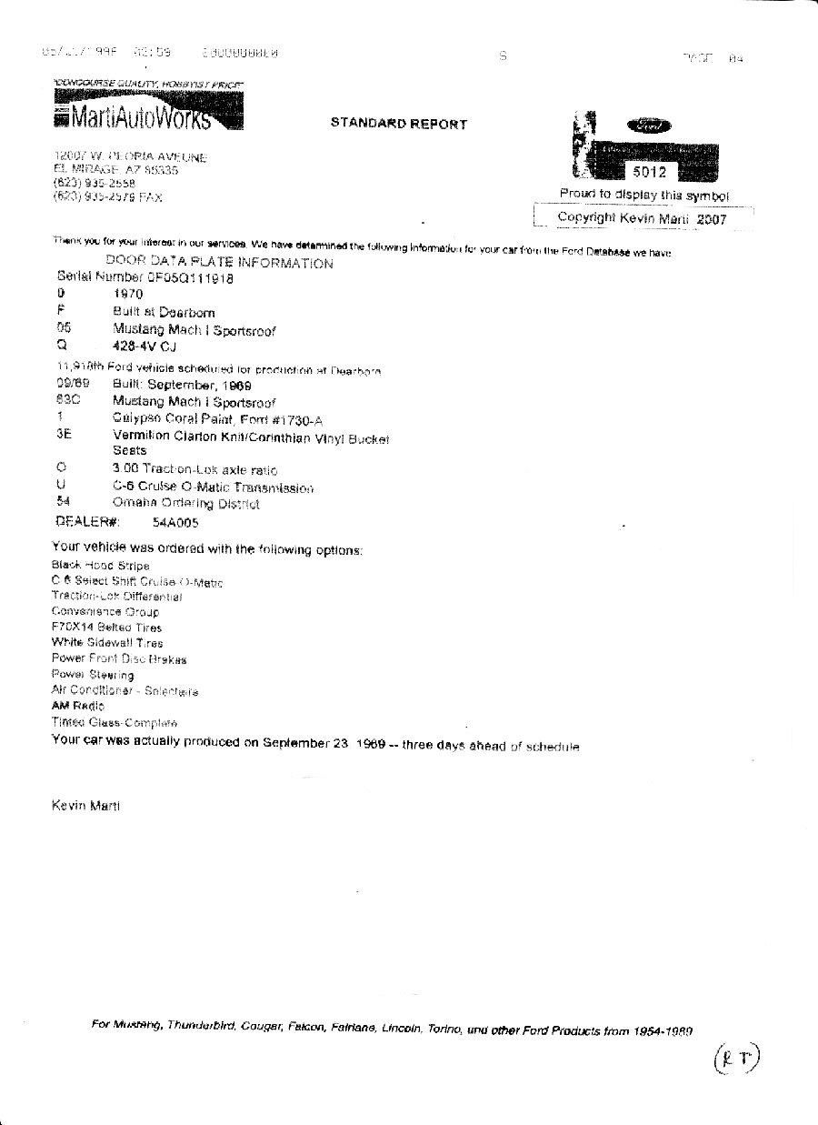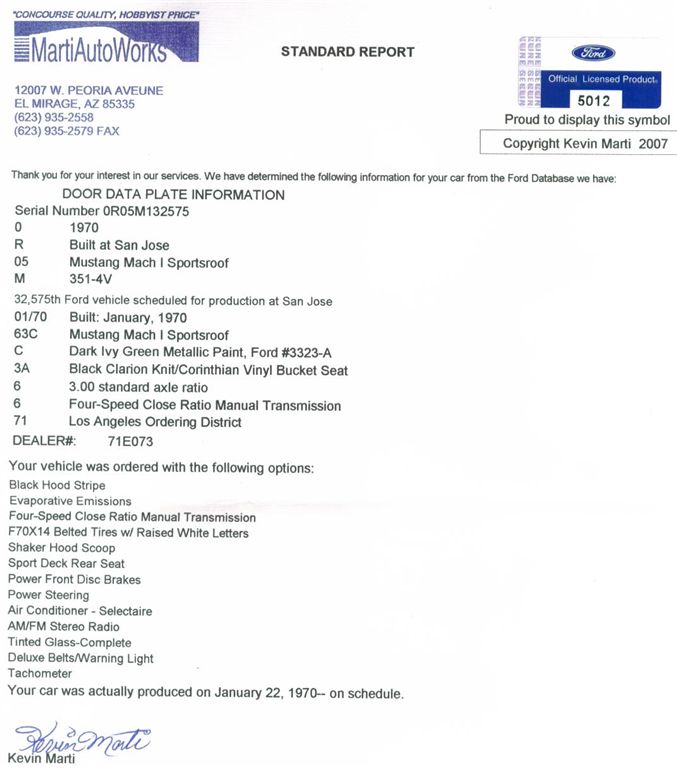 1970 Ford Mustang Fastback Mach 1 351 V8 4V 4 speed manual (factory Shaker) VIN ORO5M132575 Check the Marti Report for all the options on this show condition Mach 1 with factory Shaker Assembly. If you want one of the best Mach 1 out of the US, be quick, this car turns heads.