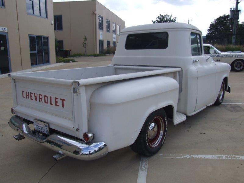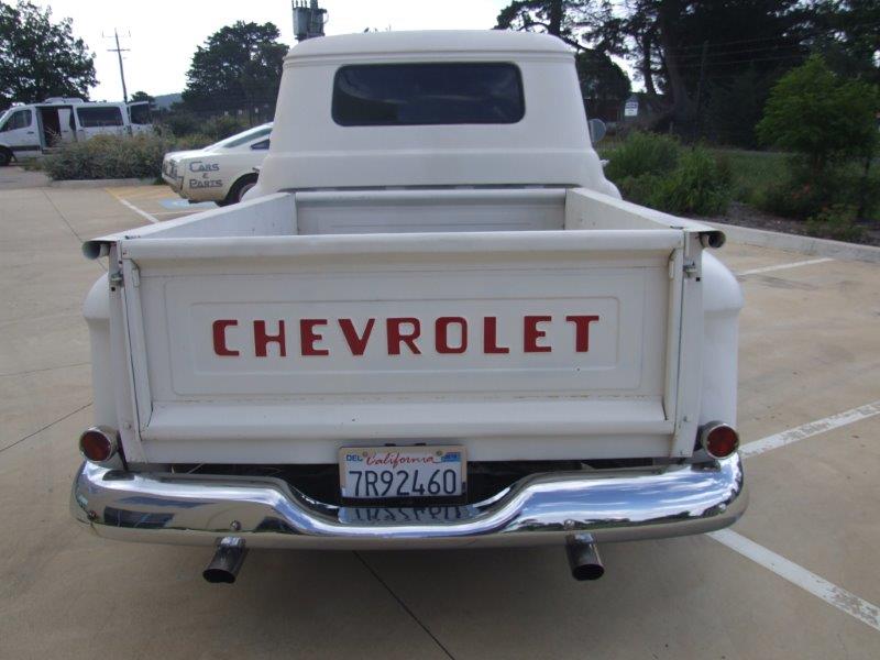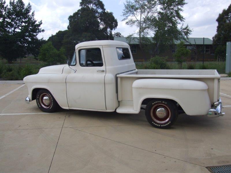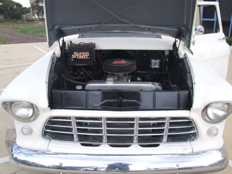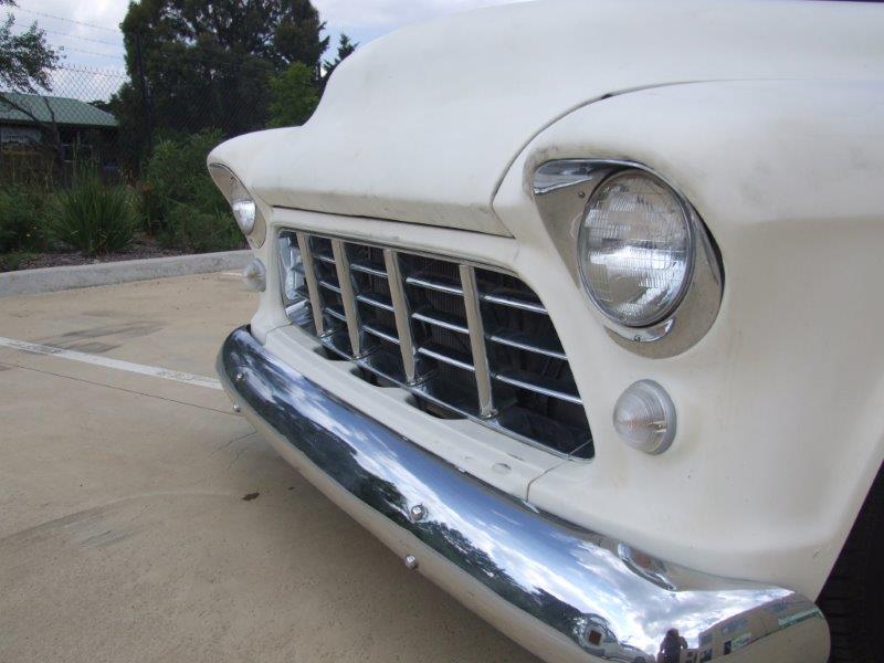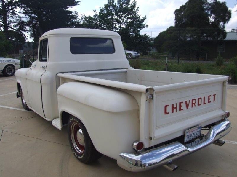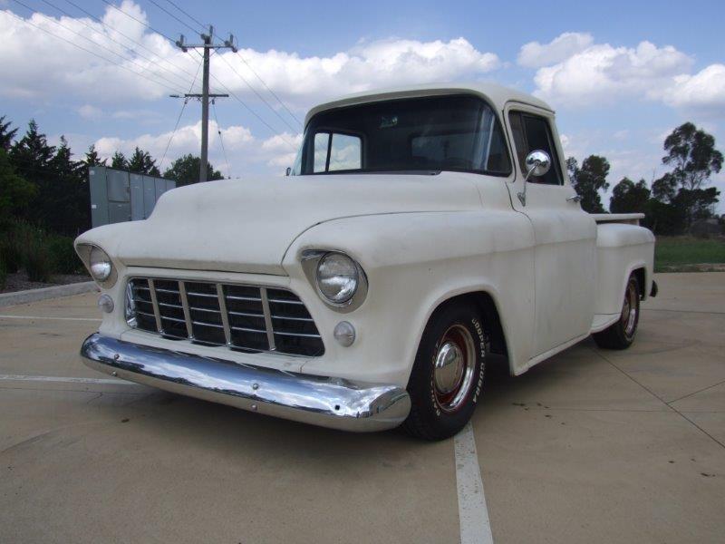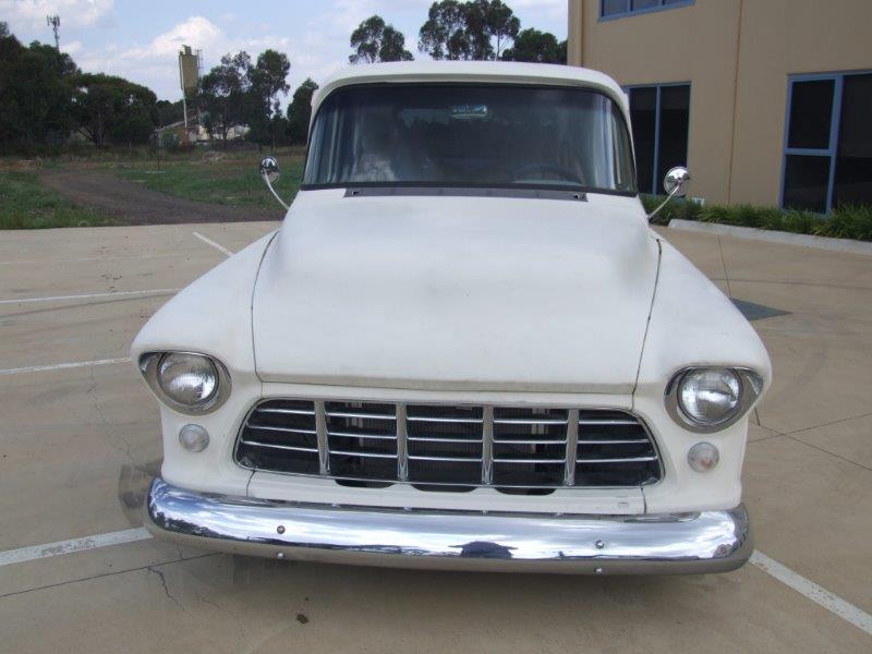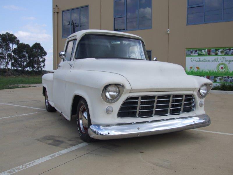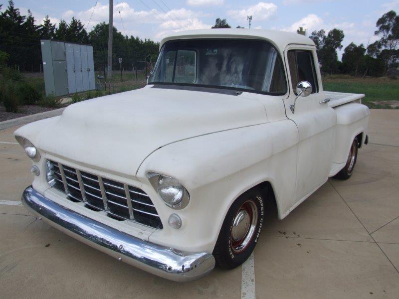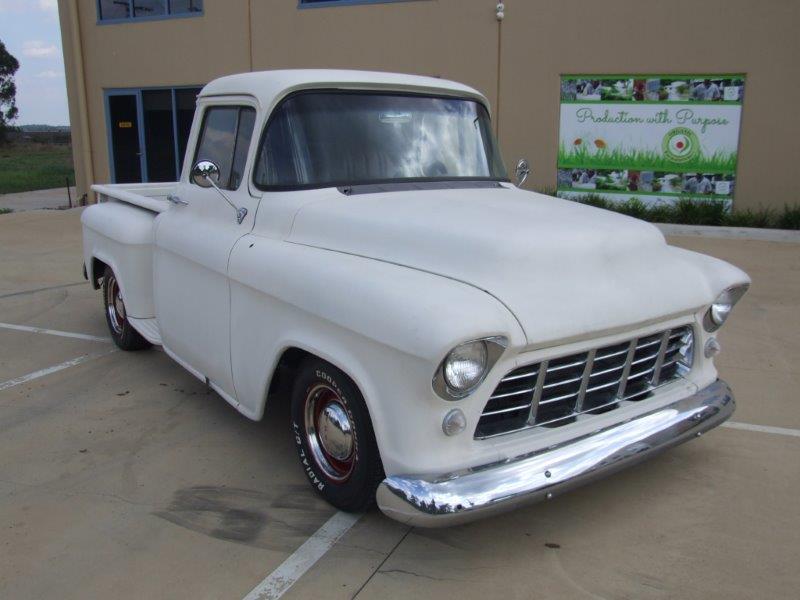 Here we have an excellent bodied 55 Chev that rarely becomes available in such clean condition -becoming very hard to source -this one came from a friend up near San Jose -it was his mates truck.Chev has 4 wheel disc brakes  -i cannot find any rust in this truck -floors and rails are perfect -see interior shots -will need a new bed  but a nice Tasmanian oak would do the job. Truck has the old style Klaxon horn ,sounds great. Does have ford hubcaps but they can be replaced with Chev